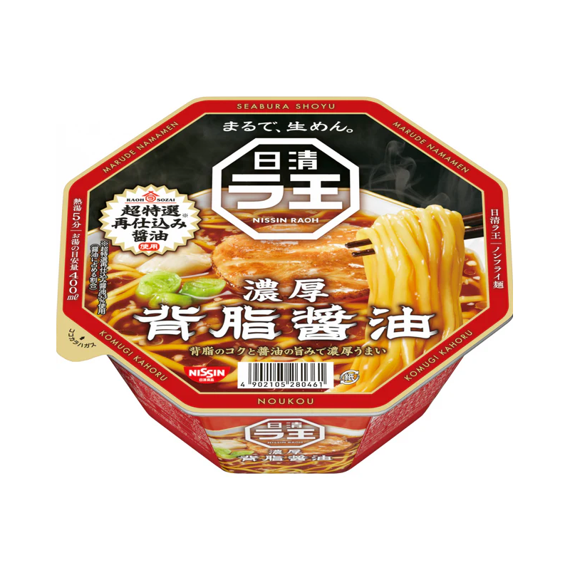 Noodles (wheat flour (domestically produced), salt, vegetable oil, chicken seasoning, soybean dietary fiber, egg powder), soup (soy sauce, lard, chicken extract, chicken fat, protein hydrolysate, salt, vegetable oil, dried sardine seasoning, pork extract, flavor seasoning, flavor oil, onion seasoning oil, sugars, fish meal, chicken seasoning, mackerel seasoning oil, spices), toppings (roasted pork, green onions) / modified starch, seasoning (amino acids, etc.), kansui (liquid water), calcium phosphate, caramel color, flavoring, alcohol, acidulant, carotenoid color, emulsifier, antioxidant (vitamin E), thickener (xanthan gum), tea extract, vitamin B2, vitamin B1, spice extract, (contains wheat, eggs, milk ingredients, mackerel, soybeans, chicken, pork, gelatin)
